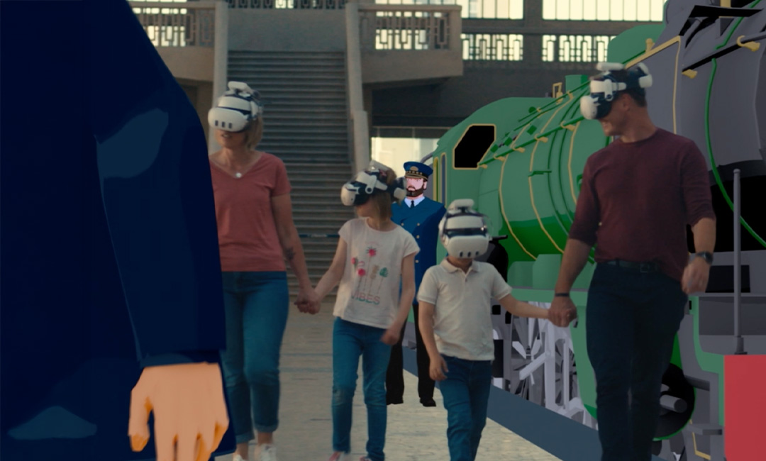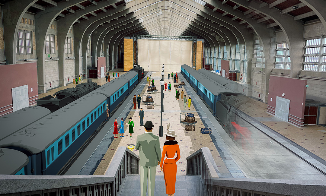 An immersive, free-roaming experience: equipped with a Meta Quest Pro / Quest 3 mixed-reality headset, visitors are free to explore the Grande Halle of the Gare Maritime for 35 minutes. Thanks to high-resolution colour passthrough, the monument’s real-world space is populated in real time with life-size transatlantic trains, boarding platforms, luggage trolleys and the signs of major shipping companies bound for New York, Southampton or Le Havre. Visitors set their own pace, approach the characters and explore the details of an environment recreated with documentary precision.
