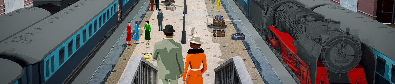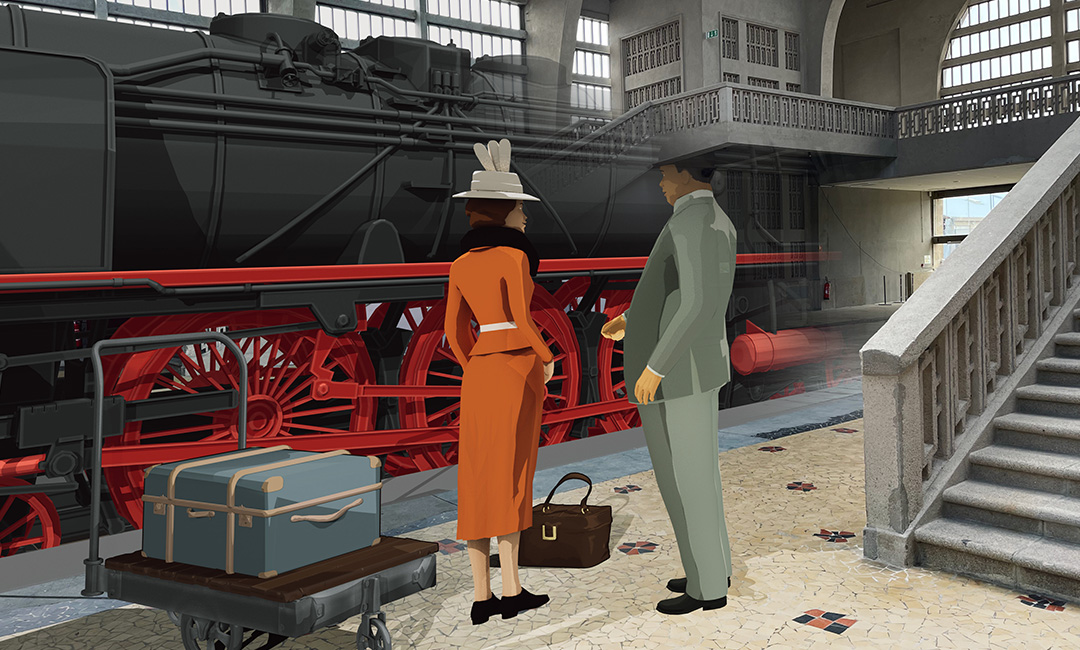 Historical figures within sight: a dozen characters inhabit the hall — the station’s architect and interior designer, a porter, members of a jazz band, a shipping company employee, and travellers eager to discover the Queen Mary. Each character has been fully modelled in 3D, rigged, animated and dressed in the fashion of the 1930s, with attention paid to expressions, gestures and costume details that make every encounter believable and lifelike. The walking and gestural animations have been crafted so that each character exists in the space as a fully-fledged presence, rather than a mere hologram.