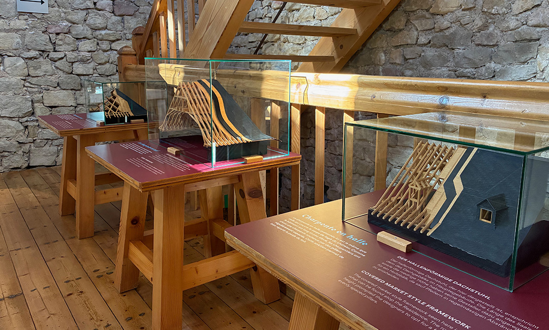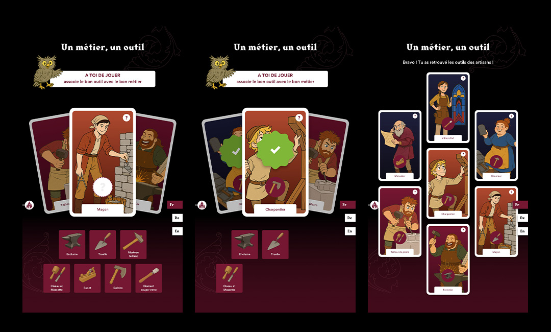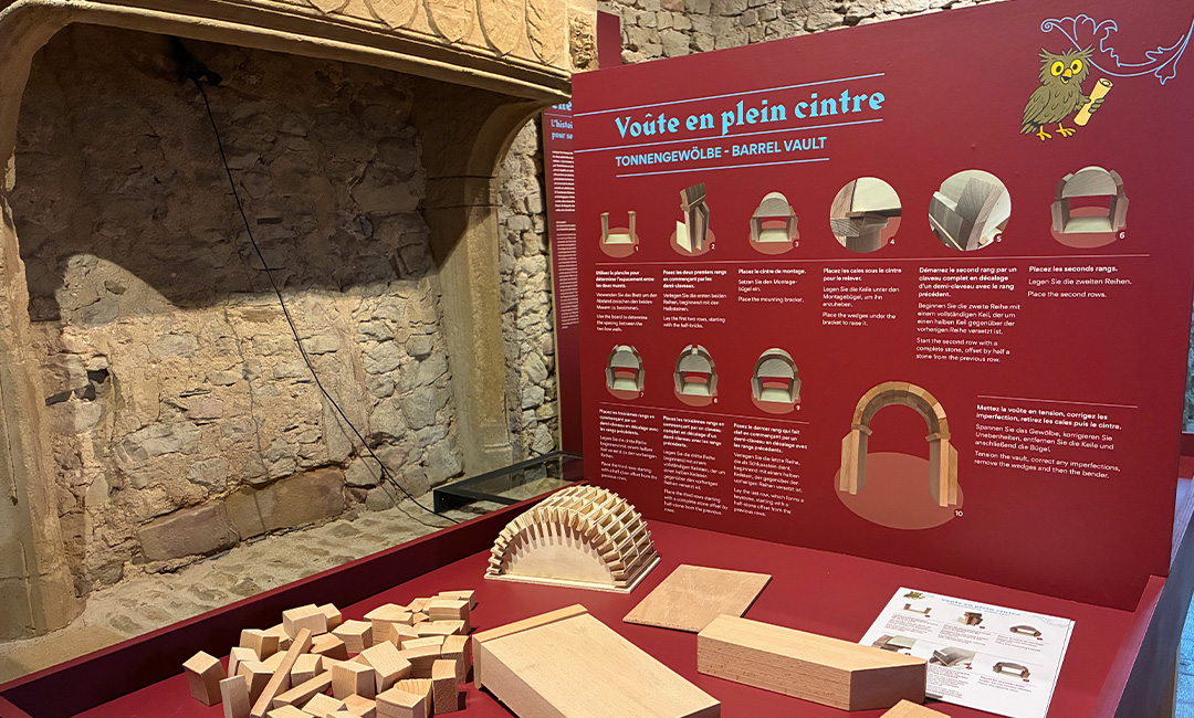 Following on from an initial dramatised historical tour created in the ceremonial hall, the Moselle Department commissioned Anamnesia to design and create a second educational space, housed in the Ladies’ Tower. This second phase marks a shift in focus: the space is no longer dedicated to historical narration, but to the interpretation of medieval architecture and the skills involved in the restoration of built heritage.